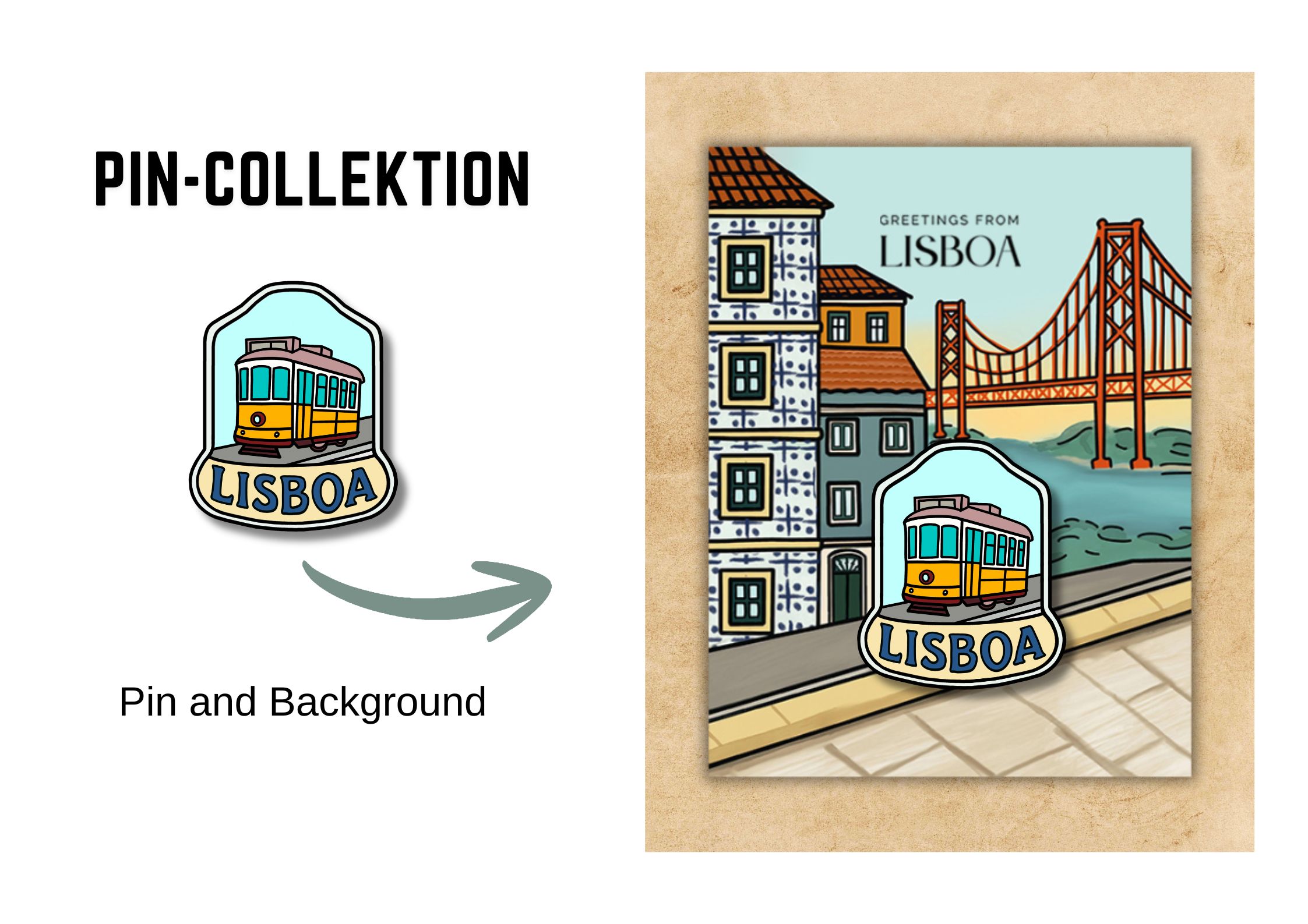 Pin Collection consisting of 18 pins + matching backgrounds for „Porta Azul“. My collections are available in 60+ stores in Lisbon and Porto alone. The collection includes designs for postcards, posters, notebooks, bags, t-shirts, and much more. They are sold in shops all over Portugal, mainly in Lisbon and Porto.
